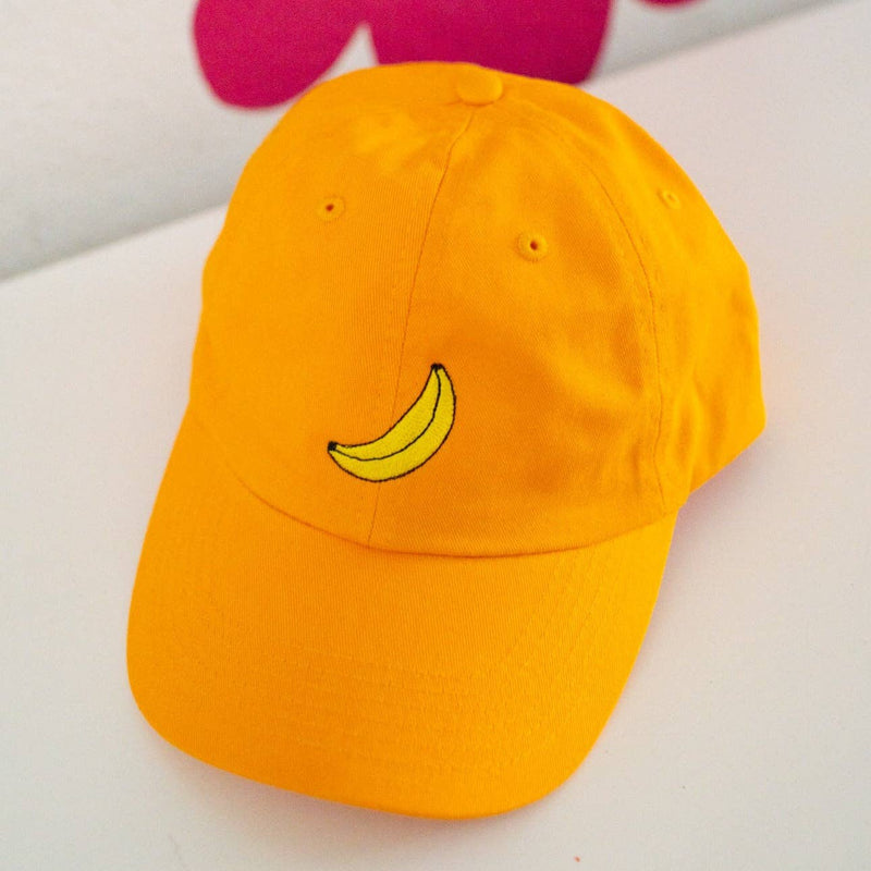 A fun trucker hat with an embroidered banana, the perfect gift or stocking stuffer for anyone on your list! It has an unstructured style and antiqued brass side buckle, giving this cap that perfect, casual-cool look. It's vintage cool with six panels and with a pre-curved bill.