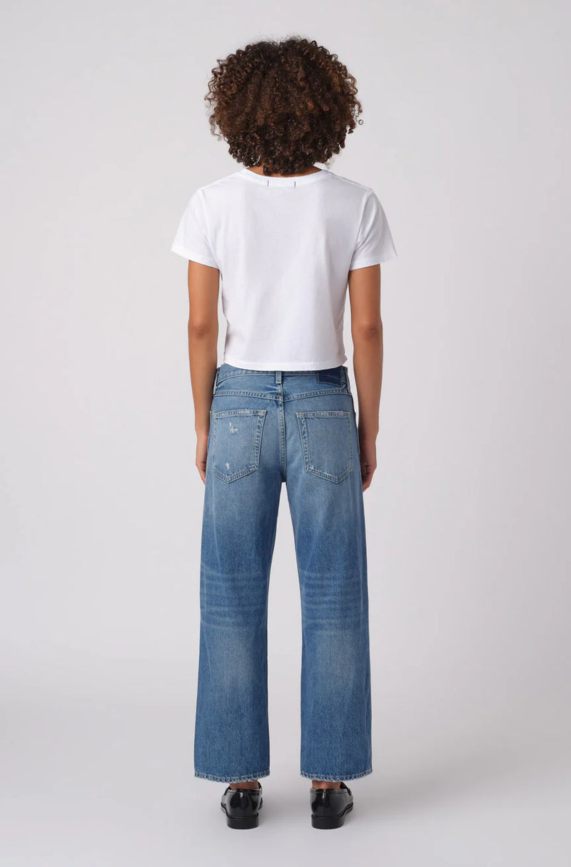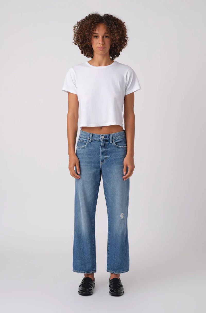 This cropped, wide straight leg is our easiest fit yet. With a mid rise, this pair is meant to sit low on the hips for a relaxed look. Thoughtful distressing throughout. Zip fly.