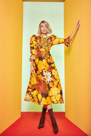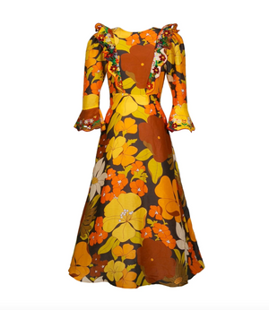 Stunning midi dress with a jewel neckline and A-line skirt cinched at the waist. With a pattern of blooming flowers in golden brown tones and a ruffle down the front with embroidered flowers makes this piece the perfect for a...