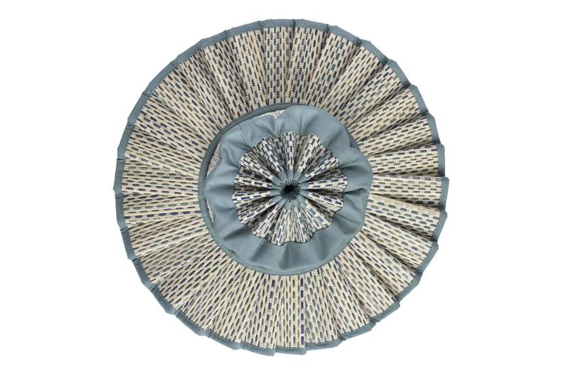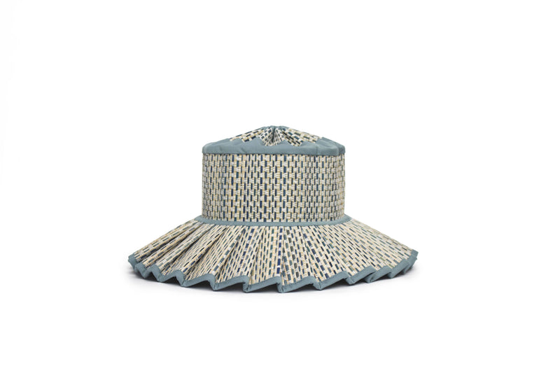 Burano features white colored thread in a basket weave, woven through its natural grass fibre base, which has been lightly hand-dyed to create a muted blue base, with dusty blue fabric trimming. Lorna Murray sun hats combine style and sun-safety. Our grass fibre woven material is certified UPF 50+, protecting your precious skin from the elements. Intentionally created for the modern lifestyle, our sun hats can be easily folded, making them compact for travel, perfect for wherever life takes you.