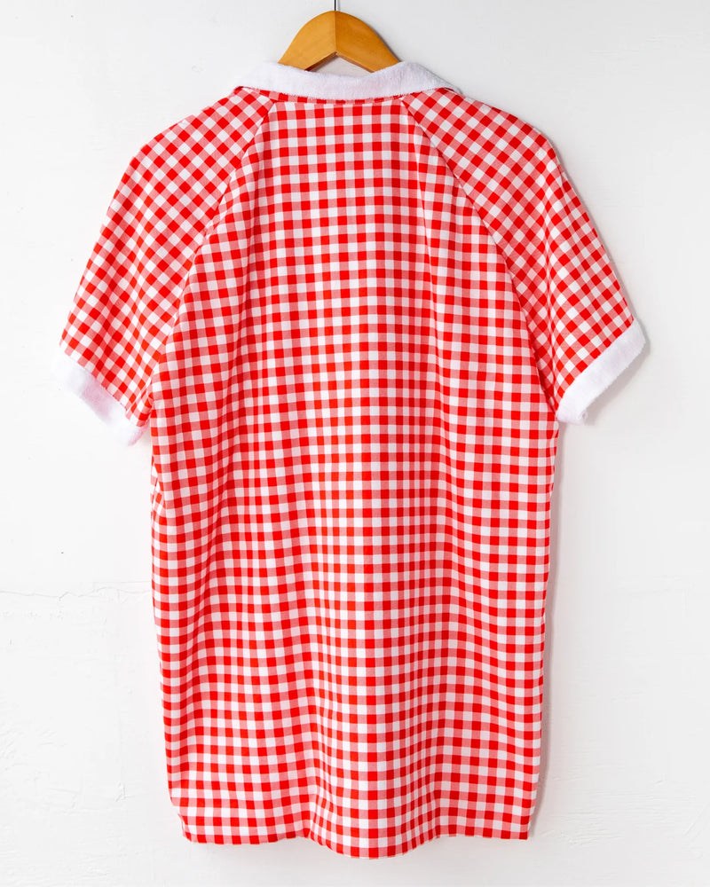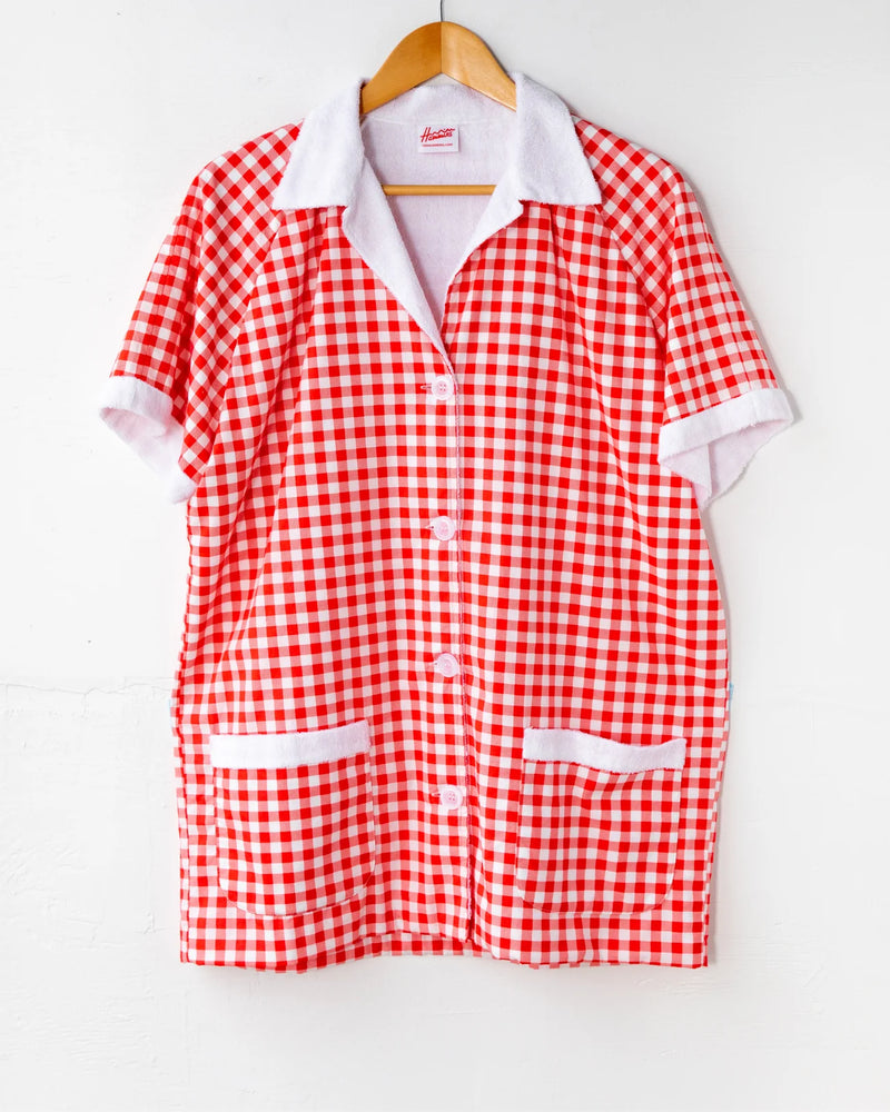 The shirt design is 100% true to its origins. The most iconic feature of the cabana shirt is the two cabana pockets on the front with white terry cloth contrasting trim and the shirt's white terry cloth liner. Like the original, it has a roomy fit and oversized collar. It comes in three gingham-print colors (Green, Red, and Yellow). It's made with 100% cotton shell and terry cloth liner.
