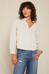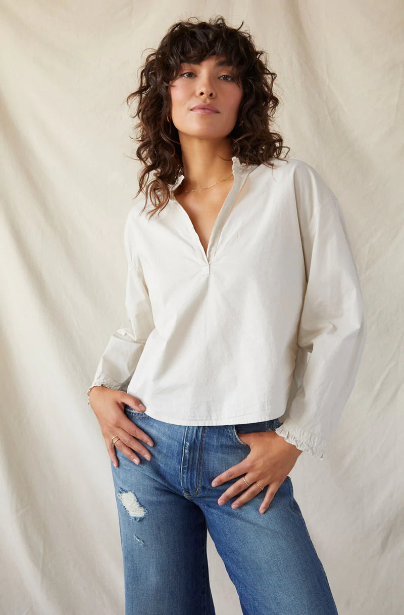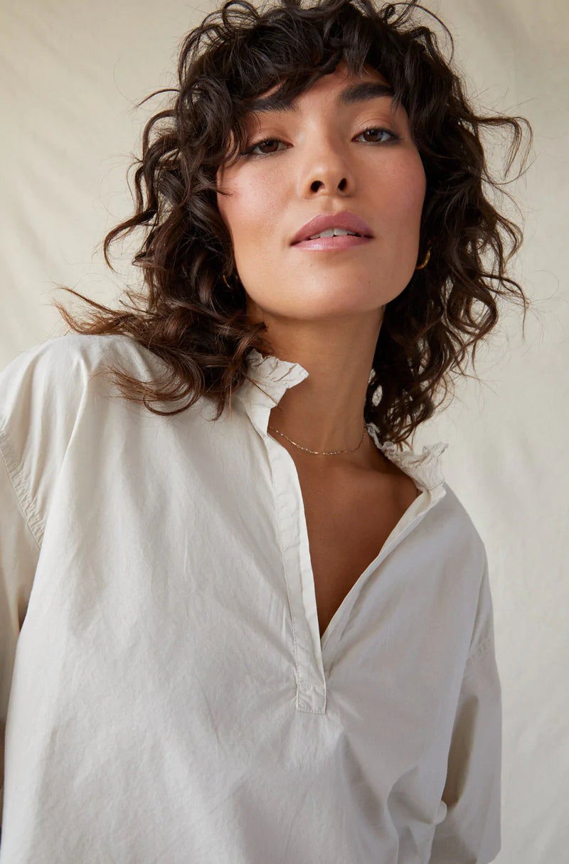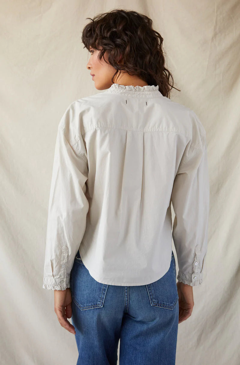 The ROSA SHIRT is a slightly oversized, pull over shirt with a boxy, easy fit. Features a ruffle detail at the collar and cuff for an added feminine detail. Crafted 100% stonewashed cotton poplin.