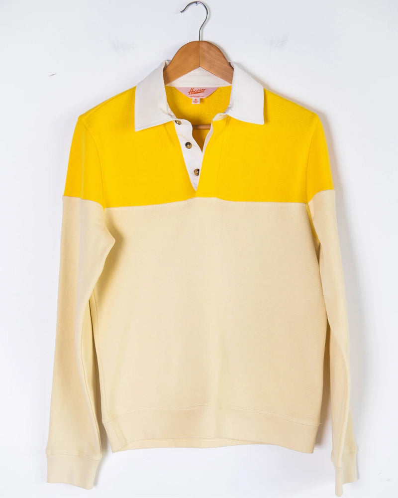 The Rugby Shirt is a classic style that is as popular today as it was in the 1960s but there's something special about vintage rugby shirts that we love: the colorways, the heavyweight fabric, the life. Unlike most rugby shirts, this one is fleece knit vs. jersey knit with ribbing at the waist, so it fits and feels just like our varsity raglan. Two separate dyed panels give this rugby shirt its two-tone look. Lastly, in classic Hammies fashion, the collar is oversized and added interfacing to it to preserve its shape and prevent wrinkling in the laundry.