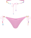 The 90's Tie Pant in Baby Spice comes straight from the 90's, with a fixed curved waistline, and strings that tie high on the hip, alluding to longer leaner legs. Crafted from a soft baby pink lurex fabric with playful colorful beads and charming details on the tie sides.
